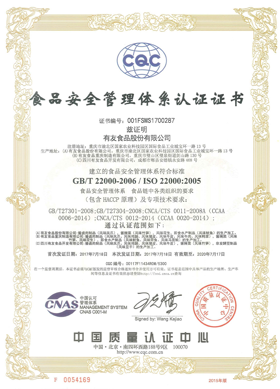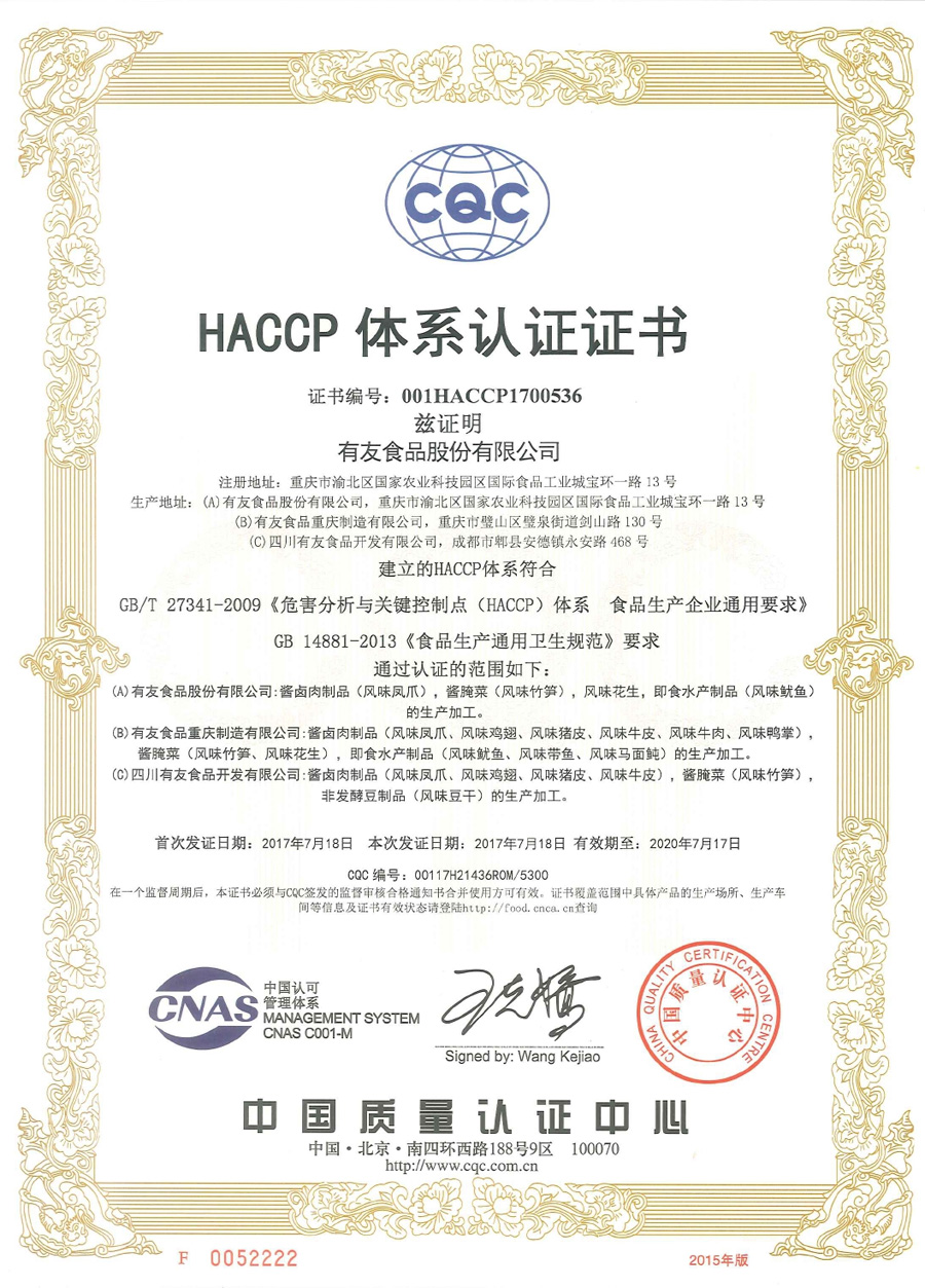 作为中国泡肉制品的龙头企业,有友食品公司始终践行“食品质量安全、责任重于泰山”的理念,从各个环节加大对产品质量的管控。二十年来,“有友泡凤爪”逐渐走入千家万户,深受广大消费者喜爱。有友食品将以此次通过ISO22000:2005标准和HACCP体系认证为契机,进一步加强对企业生产全过程的管控,提高产品质量,一如既往的为消费者提供安全、健康的好产品。