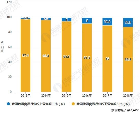 2013-2018年我国休闲食品行业线上线下零售额占比统计情况