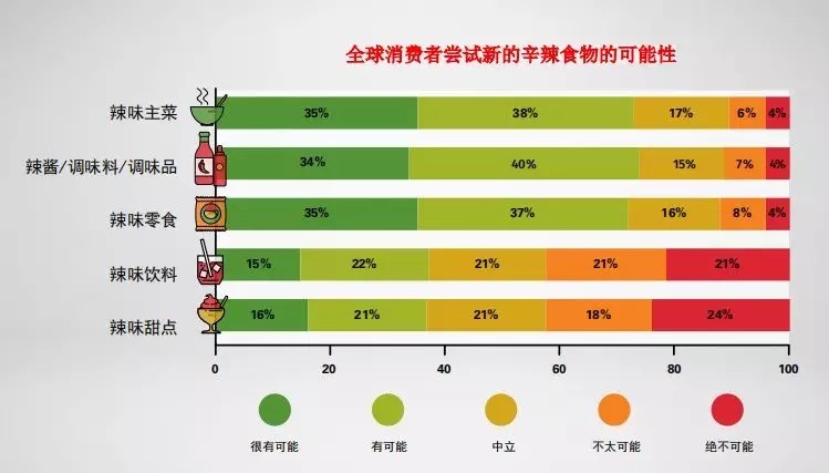 数据显示,消费者对辣味主菜、调味品和零食的接受程度很高,接近90%的消费者愿意尝试这几种食品,而辣味饮料和辣味甜点的接受度相对偏低,但也有接近60%的消费者是愿意尝试的。所以除了传统的类别,辣味在其他看起来似乎不太容易被接受的食品类别中也存在较大的市场潜力。