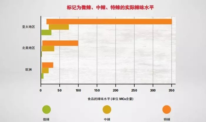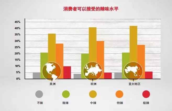 对于辛辣食品的辣味程度,各个地区的接受程度不同,欧洲消费者相对不太爱辣味,而美洲消费者喜欢重口味的极辣,亚太地区消费者则对辣味接受程度最高。比起欧洲人,美洲和亚太消费者对产生辛辣味的成分更感兴趣。但是总体数据来看,中辣都是最受欢迎的,其次是极辣,然后才是微辣。