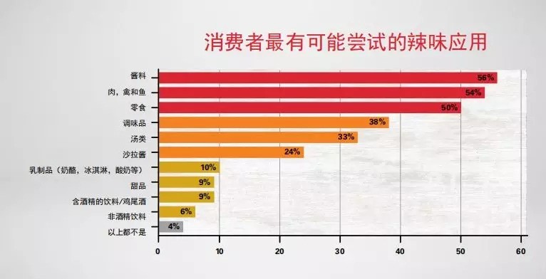 当被问到对哪种辣味更感兴趣时,大多数中国消费者选择了麻辣口味,59%的受访者说他们有兴趣尝试这种风味的食品。