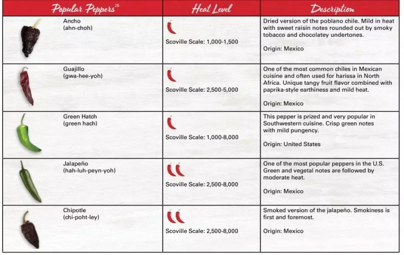 美洲消费者最感兴趣的辛辣口味包括:是拉差辣椒、黑胡椒、咖喱、辣根酱、四川辣酱、芥末、berbere(一种来自埃塞俄比亚的混合调料)、叁巴酱(一种广泛流行于东南亚国家的辣椒酱)、Harissa(一种北非混合辣椒粉)、韩国辣椒酱等。