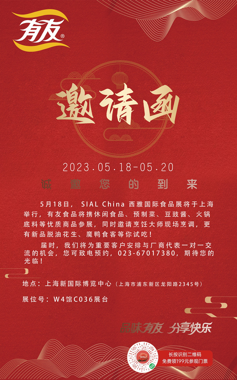 除上述新品外,本次有友食品将全面展示在休闲零食、预制菜、调味品等领域的优质产品,为消费者带来更加美味、健康和有趣的美食体验,开启美食新风潮。届时,我们还将为重要客户安排与厂商代表一对一交流的机会,您可扫描下方二维码预约。欢迎大家莅临展位!