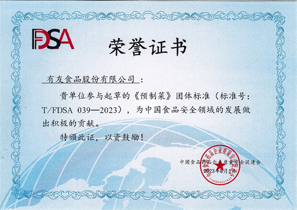 近日,有友食品收到中国食品药品企业质量安全促进会颁发的荣誉证书,以表彰我司在《预制菜》团体标准(标准号T/FDSA 039-2023)制定中的积极贡献。