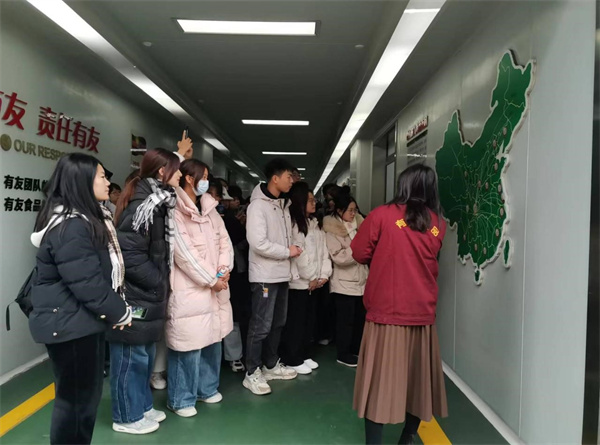 在参观产品陈列区时,公司领导邀请来访学生品尝体验公司产品并热情解答学生们关于产品制作工艺的相关问题,践行我司“服务社会、分享快乐”的企业理念。领导们表示:“恰同学少年,风华正茂,青年人是企业创新发展的源动力,欢迎在场的各位青年学子们未来能加入有友这个大家庭!” 现场氛围一片热烈,来访学生情绪高涨!